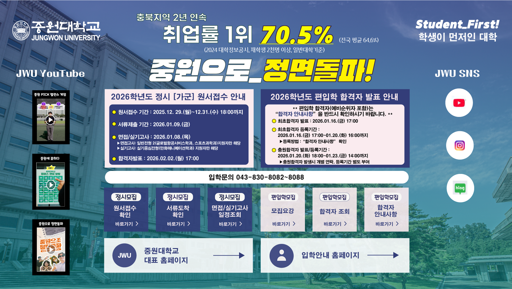 중원 PICK 밸런스 게임 중원에 꽂히다 중원으로 정면돌파 정시모집 원서접수 확인 정시모집 서류도착 확인 면접/실기고사 일정조회 편입학모집 모집요강 편입학모집 합격자 조회 편입학모집 안내사항 중원대학교 홈페이지 바로가기 입학처 홈페이지 바로가기 중원대학교 유튜브 중원대학교 인스타 중원대학교 블로그