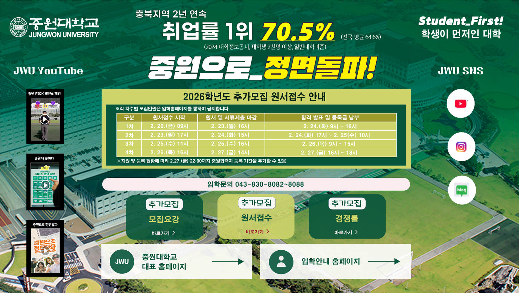 중원 PICK 밸런스 게임 중원에 꽂히다 중원으로 정면돌파 추가모집 모집요강 추가1차 합격자조회 추가2차 합격자조회 추가3차 합격자조회 중원대학교 홈페이지 바로가기 입학처 홈페이지 바로가기 중원대학교 유튜브 중원대학교 인스타 중원대학교 블로그